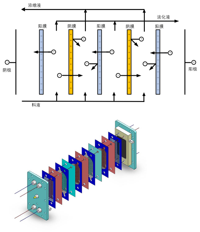 用1張陰離子交換膜、1張淡化室隔板、1張陽離子交換膜和1張濃縮室隔板的交替疊放構成了1個膜對; 若干膜對疊放一起,兩側加上電極室隔板則構成了膜堆;膜堆兩側放置電極、配水板及夾緊板則構成了電滲析器。