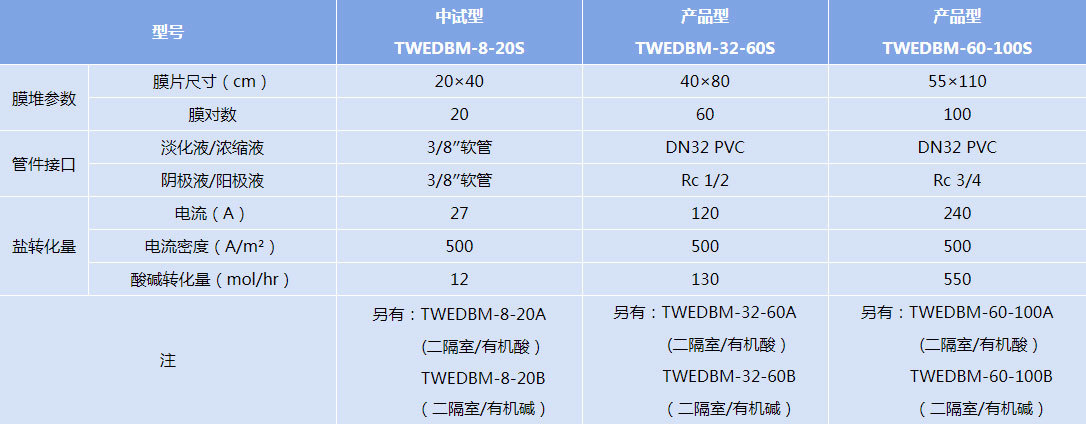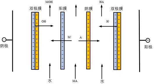 包括三隔室雙極膜電滲析器和二隔室雙極膜電滲析器兩種;三隔室雙極膜電滲析器適用于將無機鹽轉化為對應酸和堿,膜對由雙極膜、陽離子交換膜和陰離子交換膜組成,包含鹽室、酸室和堿室;二隔室雙極膜電滲析器適用于將有機酸鹽轉化為有機酸和堿或將有機堿鹽轉化為有機堿和酸,膜對由雙極膜和陽離子交換膜(包含料室和堿室)或雙極膜和陰離子交換膜(包含料室和酸室)。