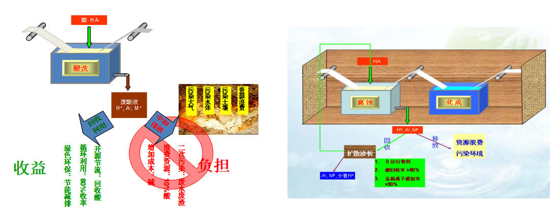 回收酸可用于新產品開發(fā),也可蒸發(fā)濃縮回用到前序生產過程中,大幅度降低廢酸排放量,減少了中和用堿的量,整個過程無新污染物排出,工藝綠色環(huán)保。