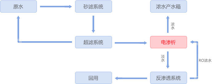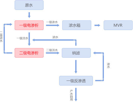 稀土氧化物催化劑生產過程中會產生大量3-5%硝酸鈉廢水,采用均相膜電滲析裝置將硝酸鈉濃縮到20%以上進入蒸發系統,淡水經反滲透處理后回用。該均相膜電滲析產品解決了異相膜和部分進口均相膜濃縮倍數不高、不耐金屬離子污染的問題,同時實現含硝酸鈉廢水零排放及資源化利用。