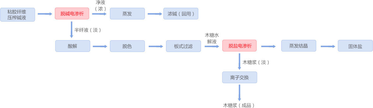粘膠纖維生產過程中產生大量壓榨廢堿液,以前轉移到污水處理廠用酸中和,不僅產生大量固廢,而且造成資源浪費。采用均相膜電滲析裝置,壓榨堿液經電滲析脫堿回用,脫堿后的半纖經酸解、電滲析脫鹽凈化后生產木糖,該工藝是工業廢棄物資源化利用并實現廢水零排放的典型案例。該項目已連續運行兩年,全年可實現20萬噸高含量半纖維素堿法漿處理回用,對傳統產業工藝綠色化改造具有重要意義。