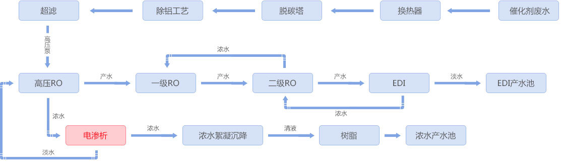 煉油催化劑生產過程中產生3%左右的硝酸銨廢水,采用均相膜電滲析裝置進行濃縮淡化,濃水硝酸銨濃度達到20%后進入蒸發系統,電滲析淡水經反滲透處理后回用,實現含硝酸銨廢水資源化利用及零排放。