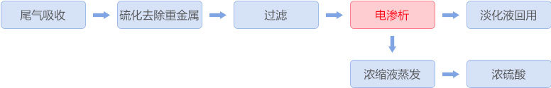 鉛、鋅冶煉制酸系統及濕法冶煉車間排出大量污酸,若采用傳統中和工藝處理則產生大量廢渣。采用均相膜電滲析裝置可將酸濃縮至10%以上,再進入蒸發系統進一步濃縮后回用,酸回用率超過90%;淡水回用至煙氣凈化工段,淡水回用率超過60%。該工藝實現了酸和水資源的高效回收,大幅度減少固廢產生。